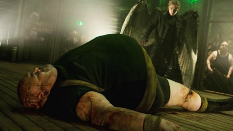 Remetendo ao X-Men Origens: Wolverine, há algumas lutas cheias de mutantes acontecendo com apostas aparentemente ilícitas. Antes de ver Anjo enfrentar Noturno, vemos um rosto familiar no chão: Fred Dukes, mais conhecido como Blob. A aparência de Dukes provavelmente é uma referência ao primeiro filme solo do Wolverine. Boa sorte pros caras que tiveram que carregá-lo pra fora do ringue.