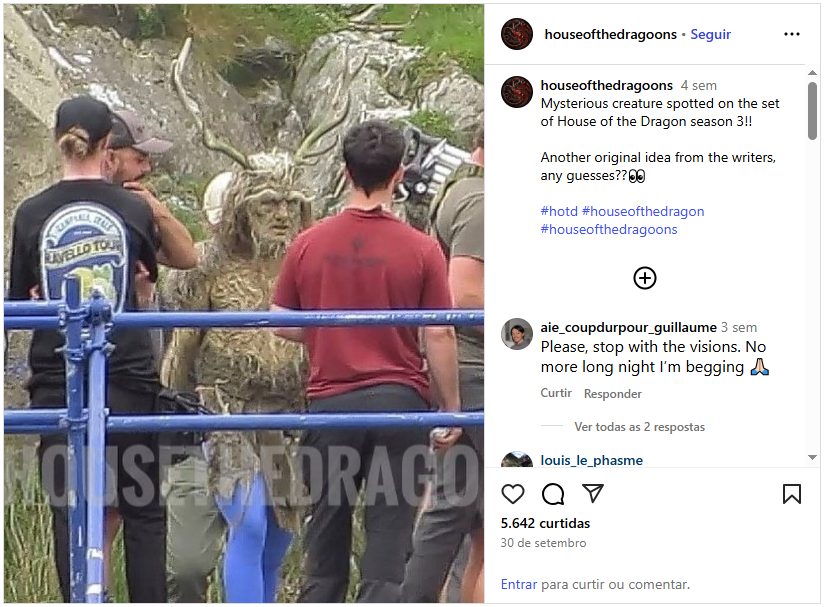 Na foto, é possível ver um personagem caracterizado com pele lembrando musgo e grandes chifres de alce. A conta no Instagram que divulgou a imagem cogita que seja uma criação exclusiva da série, mas quem conhece melhor a obra de Martin, sabe do que se trata. Veja: