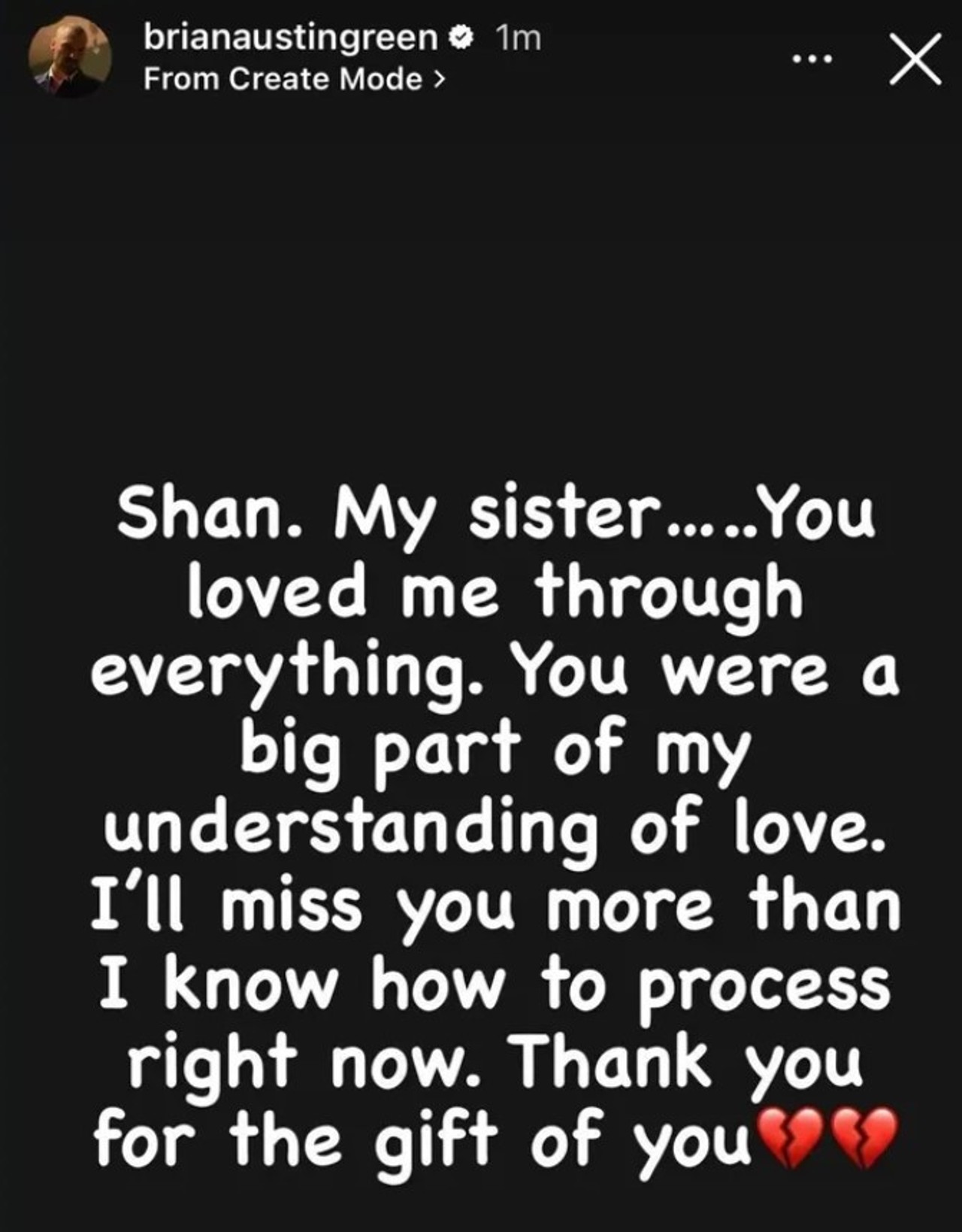“Shan. Minha irmã… Você me amou através de tudo. Você foi uma grande parte da minha compreensão do amor. Sentirei sua falta mais do que sei como processar agora. Obrigado pelo presente que foi você.”