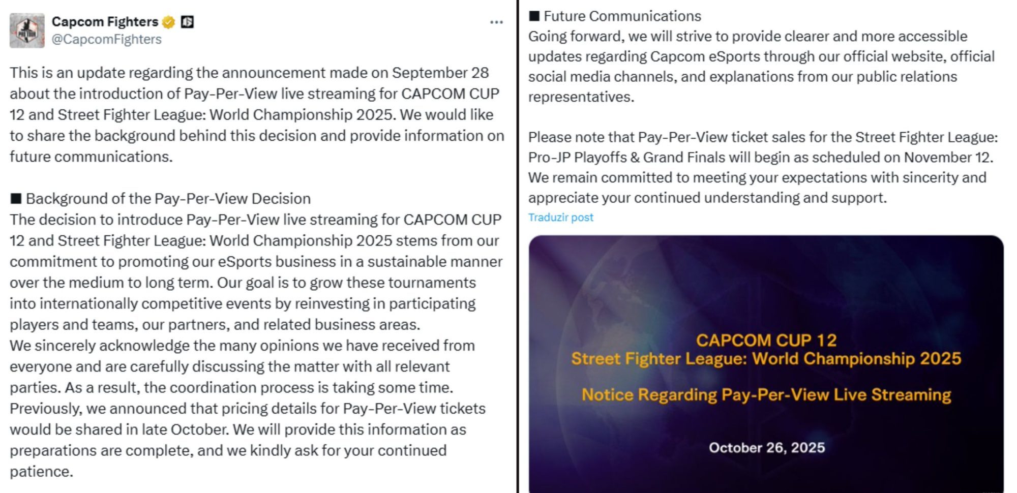 A Capcom gerou debate entre os fãs de Street Fighter 6 ao anunciar que as finais de seus principais torneios terão transmissão online via pay-per-view. A medida foi anunciada durante a Tokyo Game Show e será aplicada para a Capcom Cup 12, marcada para 14 de março de 2026, e para a SFL World Championship, no dia 15 de março de 2026.