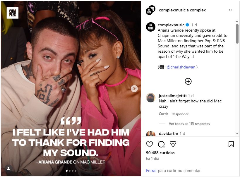 Vale lembrar que, além de The Way, os dois colaboraram em outras faixas e mantiveram uma relação próxima até o fim trágico do músico em setembro de 2018. Atualmente, Ariana Grande segue sua vida pessoal e está em um relacionamento com o ator Ethan Slater, após seu divórcio do empresário Dalton Gomez.