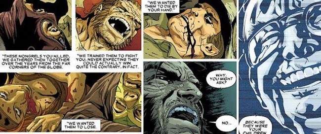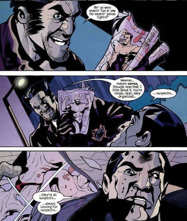 No final da batalha, uma pilha de revistas de homens musculosos escorrega da caixa de correios do Justiceiro. Wolverine então questiona a sexualidade do rival, que argumenta que as revistas eram apenas pesquisas de “suspeitos”. É assim que um valentão homofóbico da oitava série luta, Logan…