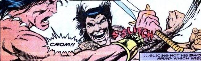 Em “O Que Aconteceria Se… Wolverine enfrentasse o Conan”, Logan fatia a mão do poderoso Cimério. No mínimo covardia.