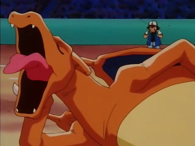 O protagonista perdeu após decidir usar seu Charizard, que em um determinado momento, parou de obedecê-lo, costume que o famoso Pokémon tinha na época.