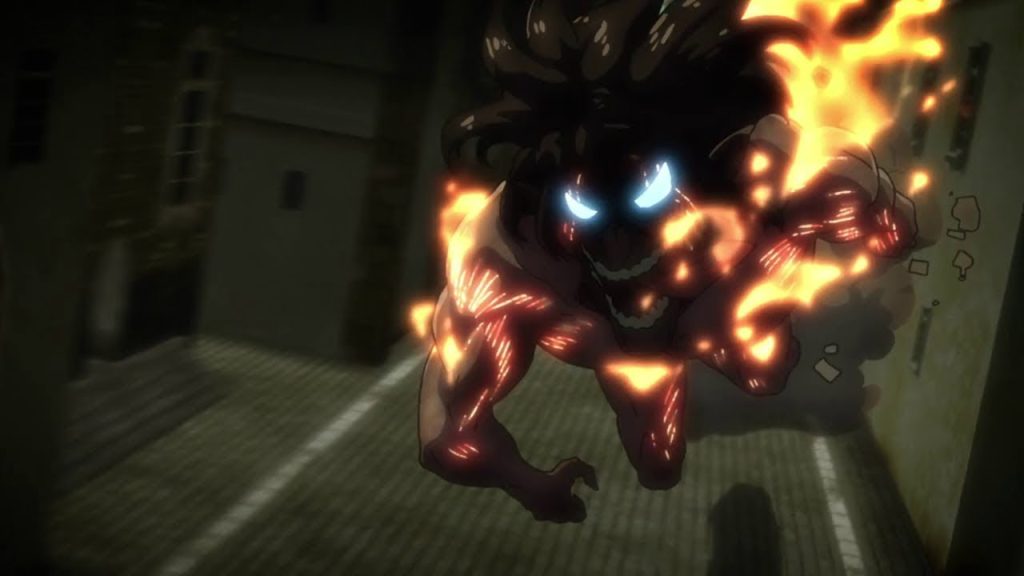 Ainda falando a respeito da luta entre Eren e Annie como Titãs, o motivo de o protagonista ter conseguido derrotá-la no anime é que ele possui o chamado “Modo Berserk”, forma em que ele fica literalmente em chamas e fica mais poderoso.