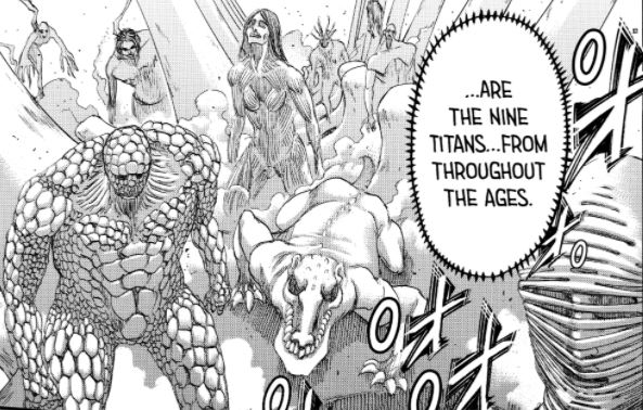 É nesse momento que Pieck Finger percebe que o Titã Fundador possui a capacidade de invocar os Nove Titãs das mais diversas eras. No entanto, o capítulo não deixa claro se eles estão agindo por conta própria ou se estão sob o controle de Eren.