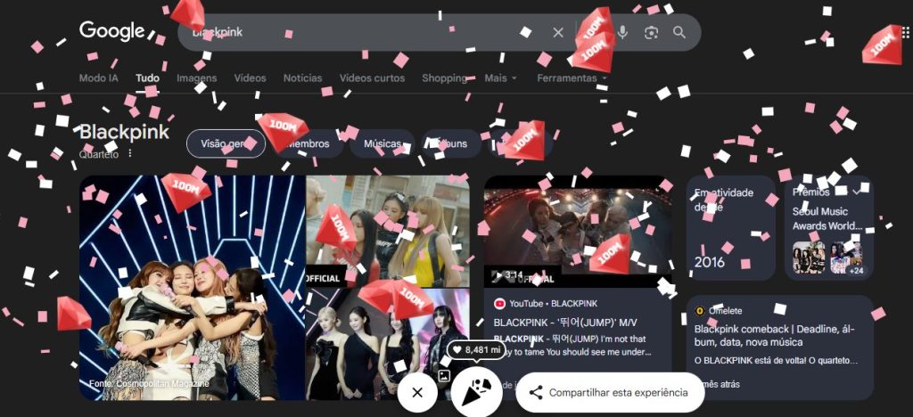 A celebração não parou por aí. O Google também decidiu prestar uma homenagem oficial a esse momento histórico. Ao pesquisar pelo termo BLACKPINK no navegador, os fãs são surpreendidos por uma animação especial: chuvas de confetes e diamantes com o número 100M caem por toda a tela. A interação é contabilizada em um contador global e pode ser repetida quantas vezes o usuário desejar, bastando apertar o botão temático criado especificamente para a ocasião.