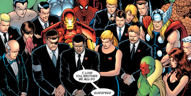 O restante dessa HQ retrata as consequências da morte do Capitão América, sentida por muitas pessoas, bem como o funeral do Sentinela da Liberdade, que contou com a presença de muitos heróis da Marvel, como você pode conferir na imagem abaixo.