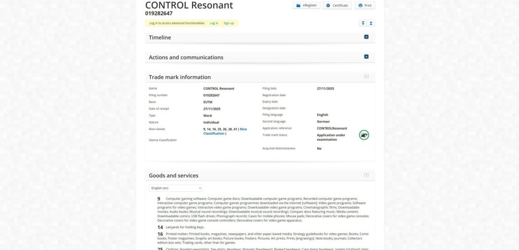 O pedido foi protocolado na Finlândia por Nordia Attorneys at Law, escritório que já representou a Remedy em registros anteriores. O uso recorrente dessa entidade jurídica reforça a conexão direta com a desenvolvedora, embora o conteúdo exato do projeto ligado a Control Resonant ainda não esteja definido.