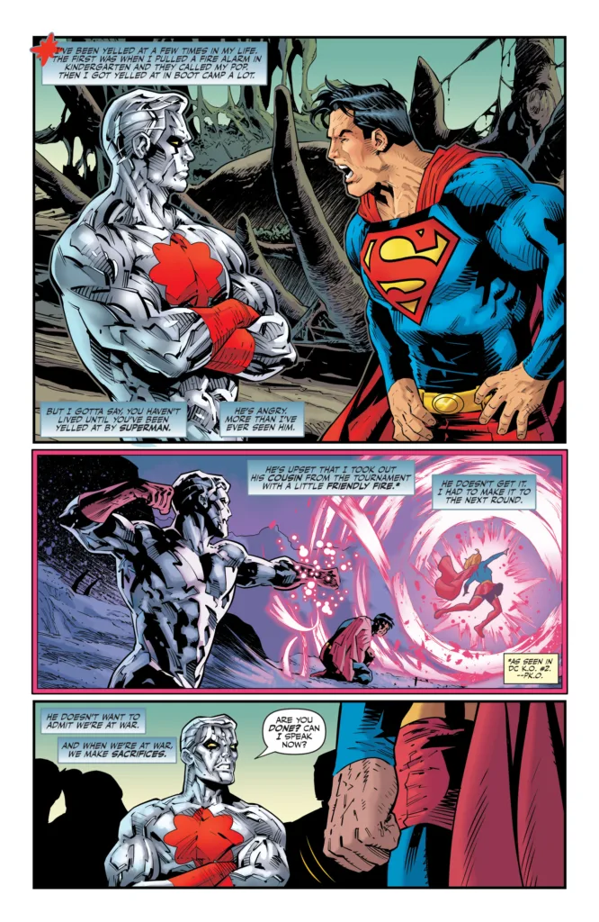 Porém, o Capitão Átomo diz que “joga para ganhar” e prepara um soco contra o Superman.