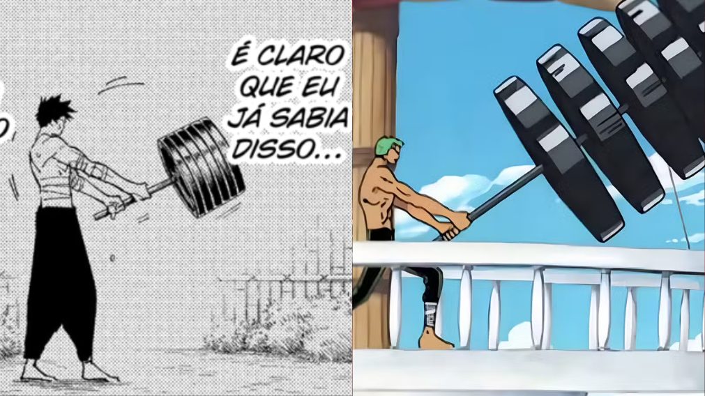 No final do capítulo quando temos o flashback de Tsurugi (um dos protagonistas) treinando, temos outra referência a One Piece, porque ele está treinando com anilhas presas a um cabo de aço, fazendo o movimento de dar uma espadada igualzinho ao Zoro.