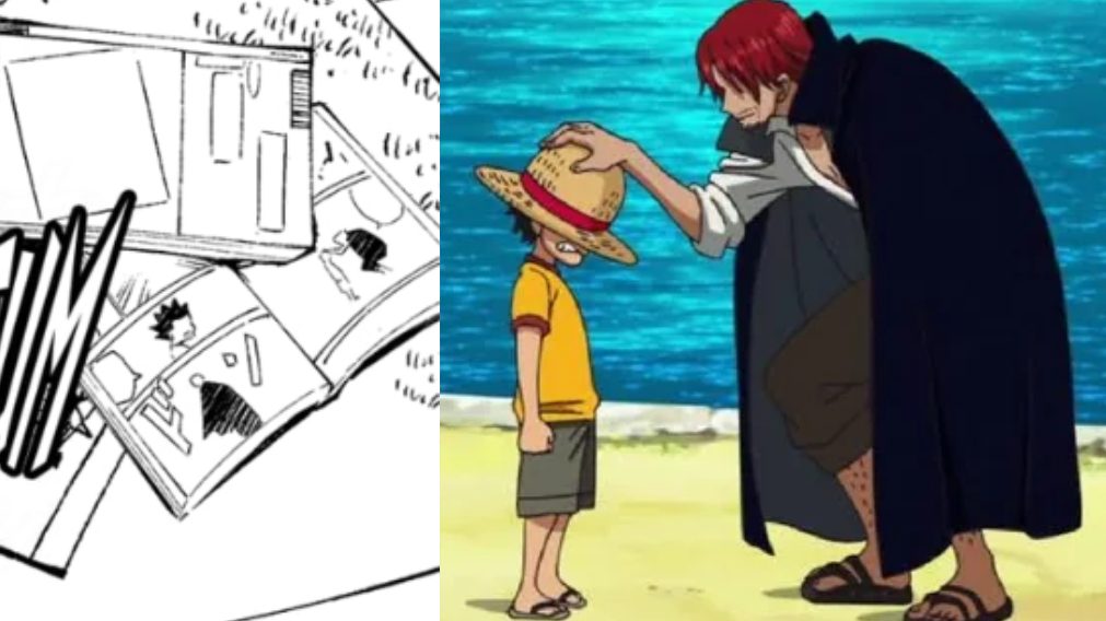 Nesse mangá em questão, tem a silhueta de um homem colocando um chapéu em uma criança, uma referência clara à cena icônica do Shanks dando o chapéu para o Luffy. Já na página do lado tem um menino de cabelo espetado muito parecido com o Gon! Mas não acaba por aí!