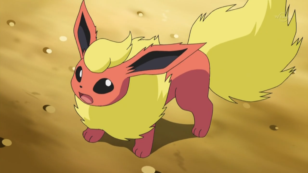 Para terminar as evoluções apresentadas na primeira geração, temos Flareon, do tipo fogo. O Pokémon surge após Eevee entrar em contato com a Pedra do Fogo.