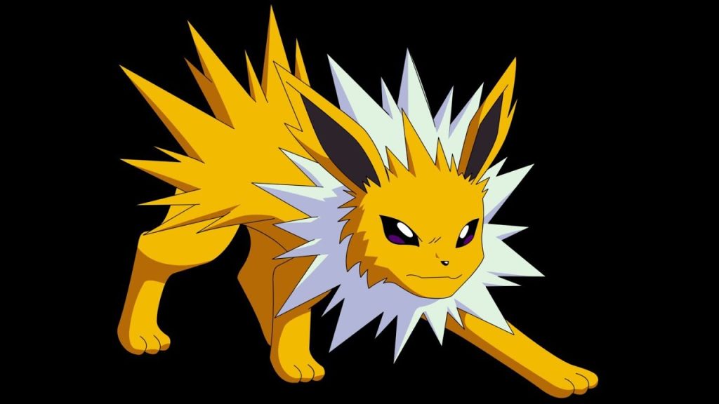 Em seguida, vem Jolteon, Pokémon do tipo elétrico que evolui a partir da exposição a uma Pedra do Trovão (a mesma que faz Pikachu se transformar em Raichu).