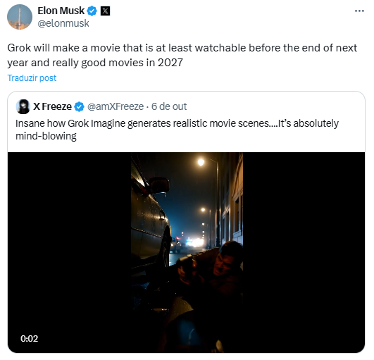 Musk também afirmou que o Grok — a IA que alimenta seu ecossistema de projetos — será capaz de criar um filme “assistível” até o final de 2026, e que fará “filmes realmente bons” em 2027.