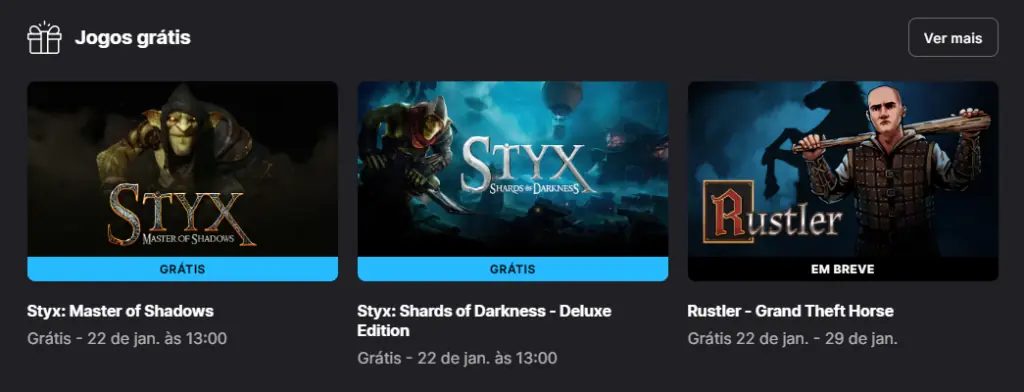 A Epic Games Store disponibilizou nesta semana dois jogos gratuitos para PC, permitindo que qualquer jogador resgate ‘Styx: Master of Shadows’ e ‘Styx: Shards of Darkness’ sem custo. A ação faz parte da política semanal da plataforma, que libera títulos completos por tempo determinado para os usuários cadastrados.