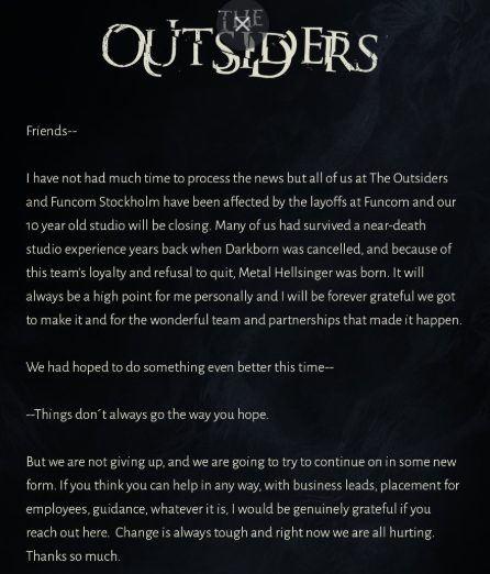 Apesar disso, os motivos exatos que levaram a Funcom a incluir The Outsiders em sua reestruturação ainda não foram esclarecidos. Não se sabe se o estúdio estava trabalhando em um novo projeto próprio ou se sua função se limitava ao suporte de Dune: Awakening no momento do fechamento.