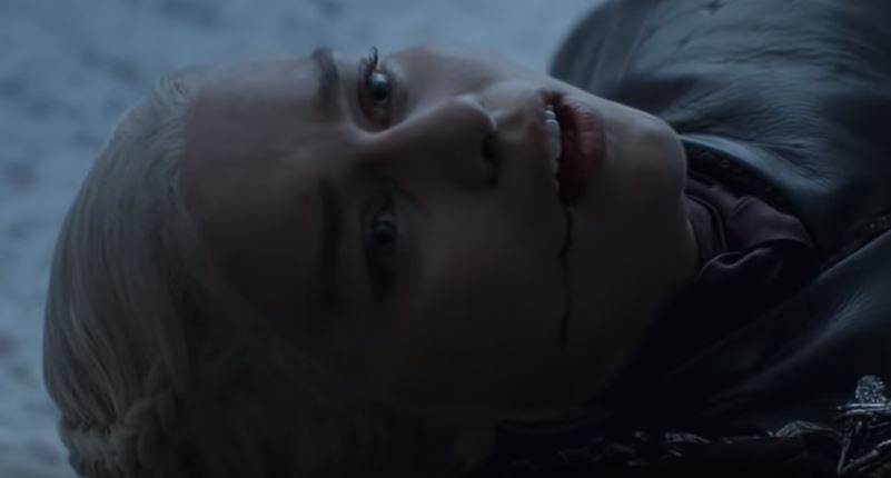Os dois se beijam, mas Jon acaba apunhalando Daenerys no peito, tirando a vida da personagem. Drogon percebe o que aconteceu, derrete o Trono de Ferro com suas chamas e leva o corpo de Daenerys para o leste.