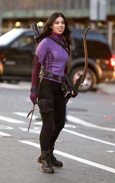 A roupa contém vários tons de roxo, cor associada ao Gavião Arqueiro, porém mais clara. Steinfeld também aparece segurando um arco um pouco mais simples do que aquele usado por Clint Barton nos filmes.