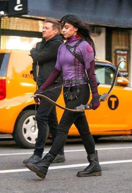 O personagem de Jeremy Renner deverá ser um mentor para a jovem heroína, que deve ter grande importância na nova fase do Universo Cinematográfico Marvel. Hailee Steinfeld pareceu confortável no traje, que deve ser usado em cenas importantes.