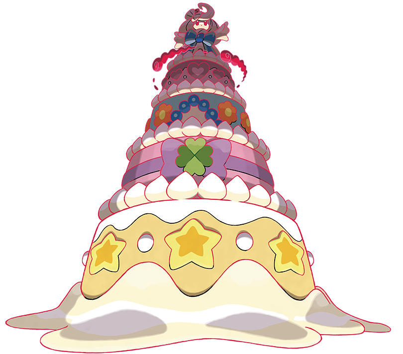Na forma Gigantamax, Alcremie ganha um visual que parece um bolo de vários andares. Assim como os outros dois Pokémon de sua geração, é preciso participar de uma Max Raid Battle.