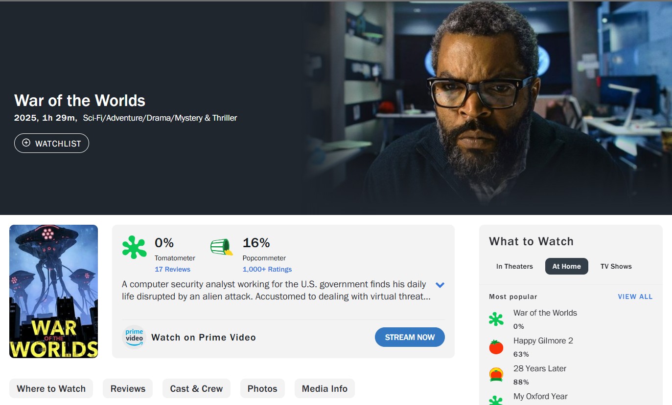 A nova adaptação cinematográfica de Guerra dos Mundos, lançada em 2025, não convenceu a crítica norte-americana. No site Rotten Tomatoes, o longa acumula 0% de Tomatometer, com base em avaliações oficiais de críticos, um resultado raríssimo que o coloca entre os piores do ano.