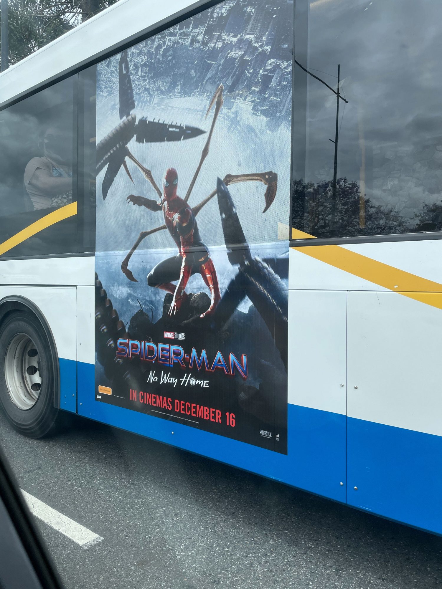 A imagem surgiu no Reddit e mostra o pôster colado na lateral de um ônibus australiano, onde podemos ver Peter Parker usando a armadura Aranha de Ferro.