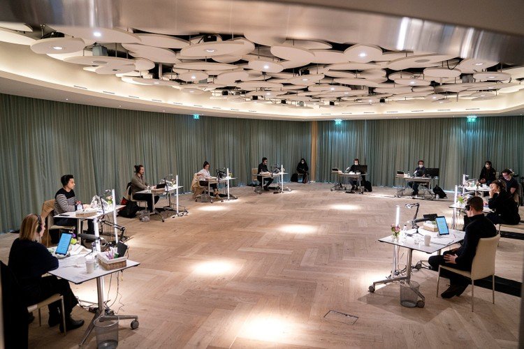 Ali, cada um em sua mesa e respeitando o distanciamento social, todos os principais atores leem o roteiro e entendem melhor os papéis de seus personagens na história, que tem tudo para agradar aos fãs da obra de George R.R. Martin.