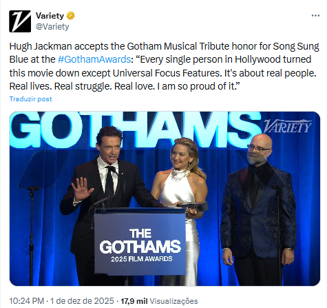 A dupla foi honrada com o primeiro Gotham Musical Tribute da história, celebrando o trabalho deles no filme Song Sung Blue – Um Sonho a Dois. Ao pegar o microfone, Jackman não perdeu a piada: “Muito obrigado. Isso é tão legal e algo para deixar o Ryan Reynolds insuportavelmente invejoso“, disparou ele, arrancando risadas da plateia.