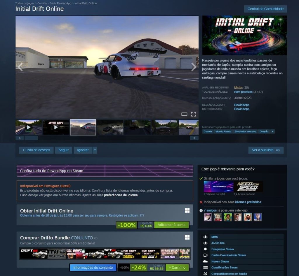 Initial Drift Online está disponível gratuitamente no Steam por tempo limitado e já pode ser resgatado por jogadores de PC. O título, que antes custava R$ 16,99, pode ser adicionado à biblioteca sem custos até 18 de janeiro, às 15h. Após o resgate dentro do prazo, o jogo fica disponível para sempre na conta do usuário.