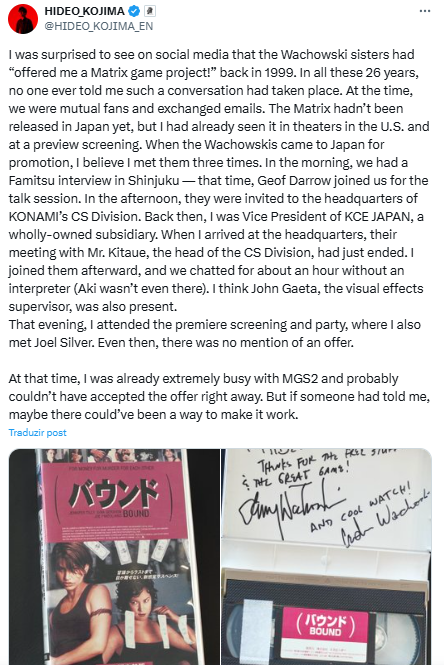 Uma história curiosa voltou à tona esta semana envolvendo Hideo Kojima, a Konami e o universo de Matrix. Segundo Christopher Bergstresser, ex-vice-presidente de licenciamento da Konami, Kazumi Kitaue — que mais tarde se tornaria CEO da Konami Digital Entertainment — teria negado de imediato um pedido das irmãs Wachowski para que Kojima desenvolvesse um jogo baseado no primeiro filme da franquia durante a estreia japonesa de Matrix.