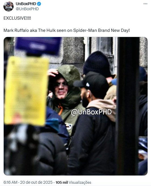 Acabou o mistério! Mark Ruffalo foi flagrado em fotos no set de Homem-Aranha: Um Novo Dia, confirmando que Bruce Banner estará mesmo no filme. Só que provavelmente não do jeito que todos esperavam, principalmente levando em conta as últimas aparições do personagem em produções do MCU.