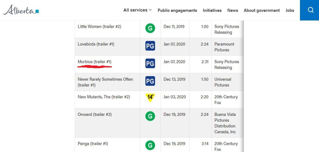 Pelo menos é isso que indicam algumas informações obtidas pelo site Trailer-Track. O portal mostra que o ‘Alberta Film Ratings’, órgão público que classifica filmes a serem exibidos no estado de Alberta, no Canadá, revelou na web que já fez a avaliação do primeiro trailer de Morbius.
