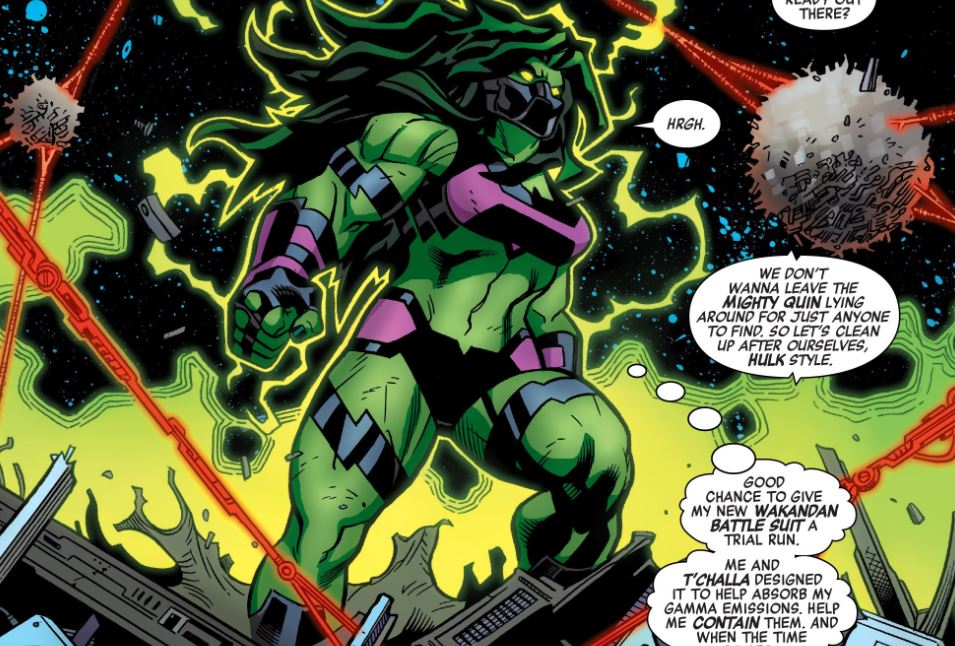 Diferente de Bruce Banner, Jennifer Walters é conhecida por manter sua inteligência mesmo quando se transforma, mas está enfrentando algumas dificuldades para controlá-la. Será que esse novo poder pode fazer a Mulher-Hulk perder sua capacidade de pensamento e até de voltar ao normal, já que está lidando com doses altas de radiação gama? Ela também pode se tornar dependente desse traje criado com tecnologia de Wakanda?