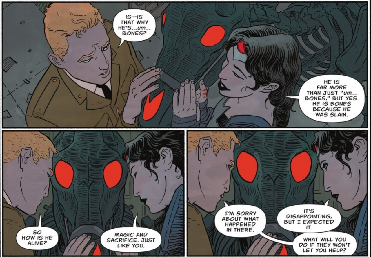 No entanto, ele foi trazido de volta à vida. De acordo com Diana, esse retorno foi possível por meio de “magia e sacrifício”.