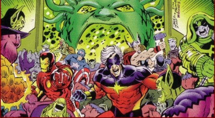 A primeira história crossover da Marvel nos quadrinhos tinha esse conflito como enredo e envolveu os Vingadores, os Inumanos e o Capitão Marvel original para interromper essa loucura intergalática. E ela possui até mesmo relação com a primeira aparição dos alienígenas nas histórias do Quarteto Fantástico, já que o Visão foi atacado por três vacas.