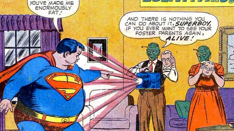 Jerry Siegel sugeriu uma série contando as aventuras do jovem Superman do passado e recebeu dois nãos consecutivos em duas décadas diferentes, até que o Robin começou a fazer muito sucesso e a DC decidiu apostar na ideia. Numa dessas aventuras, uma dupla de alienígenas se disfarçou do senhor e da senhora Kent e engordaram o Superboy ao extremo. Essa história só não é mais bizarra do que quando todas as crianças de Smallville ficaram obesas por causa das vacas contaminadas por uma fórmula de crescimento do mal.
