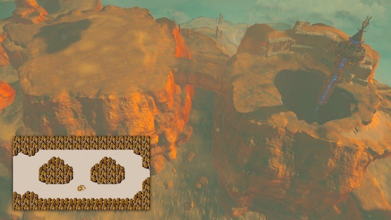 Desde a sua primeira versão há mais de 30 anos, a série The Legend of Zelda apresentou uma tonelada de paisagens exuberantes e, entre masmorras e florestas, estão algumas estruturas particulares que se destacam. Facilmente uma das localidades mais reconhecíveis é Spectacle Rock do primeiro Zelda de 1986, que retornou em alguns jogos mais tarde. Breath of the Wild apresenta uma recriação quase exata do par de rochas em forma de óculos, que pode ser visto em capturas de tela de diferentes ângulos. E, desta vez, a famosa formação aparece numa escala muito maior: em vez de grandes rochas, a Spectacle Rock é vista como montanhas gêmeas gigantes. Uma homenagem aos seus predecessores bastante sutil.