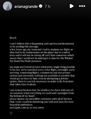 Brasil, não posso acreditar que isso está acontecendo e mais do que arrasada por estar escrevendo essa mensagem. Algumas horas atrás, minha equipe e eu tivemos que desembarcar do nosso voo, pois tiveram que fazer manutenção no avião por uma questão de segurança e ele só decolará às 11h de amanhã, o que significa que eu não chegaria a tempo para a pré-estreia de ‘Wicked: Parte 2’ em São Paulo.