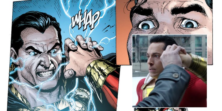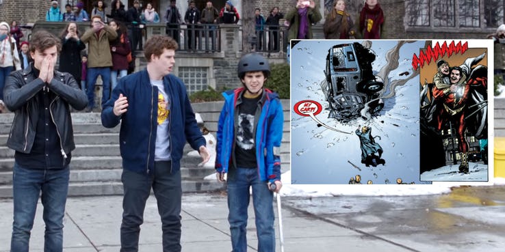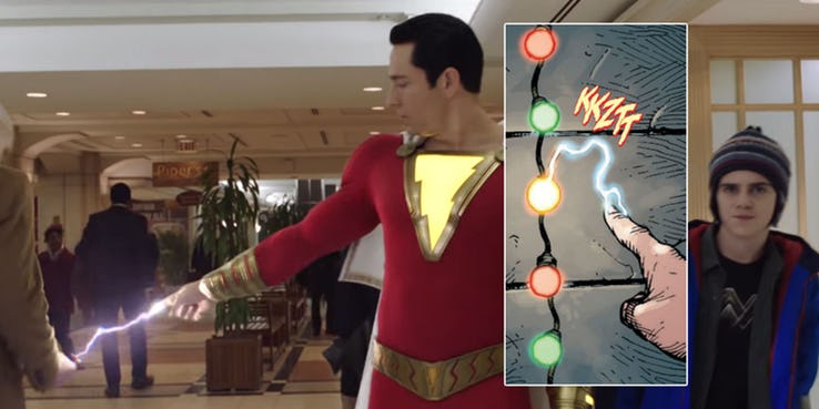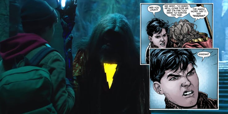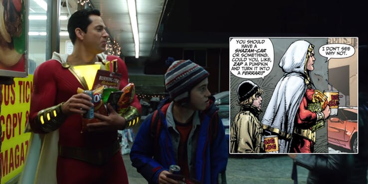 Esta cena lembra bastante a que foi abordada nos quadrinhos. Durante sua fuga dos valentões, Billy consegue entrar em um trem do metrô e escapa. No final das contas, ele acabou sendo transportado para o castelo do mago Shazam (Djimon Hounsou), que aparentou estar decepcionado em ver que um garoto foi o escolhido.