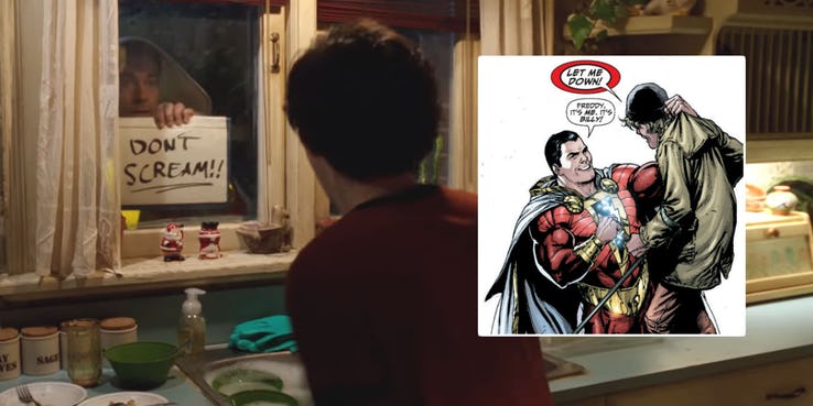A primeira pessoa que Billy decide encontrar para lhe contar a grande novidade é Freddy, seu irmão adotivo. Nos quadrinhos, Shazam! o pega pela roupa para revelar a verdade. Já no filme, ele aparecerá do lado de fora da casa, com um aviso de “Não Grite!”, que como todos vimos no trailer, foi desrespeitado.