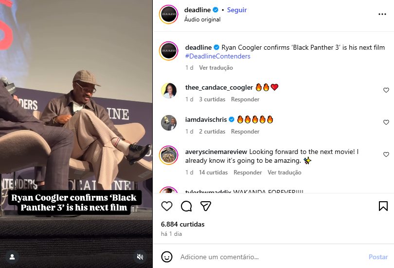 O futuro de Wakanda está oficialmente garantido. Durante o evento Contenders Film: Los Angeles, realizado neste sábado (15) pelo Deadline, o diretor Ryan Coogler, 39, confirmou pela primeira vez que “Pantera Negra 3” já está em produção. A notícia chega para animar os fãs que aguardam o próximo capítulo da saga após a emocionante homenagem a T’Challa no segundo filme.