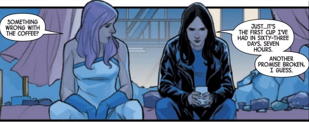 Jessica Jones, por outro lado, é praticamente movida a cafeína. Em Alias, ela aparece o tempo todo com uma caneca de café na mão. É assim que enfrenta investigações, traumas e a própria bagunça emocional.
