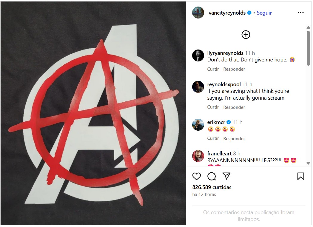 Sem nenhuma legenda, Reynolds postou uma foto em seu perfil no Instagram que traz o que parece ser uma camiseta, pela textura da imagem. Nela, podemos ver o clássico logo com a letra A de Avengers (Vingadores), sobreposta por uma segunda letra A vermelha, com um círculo em volta, símbolo frequentemente associado ao anarquismo.