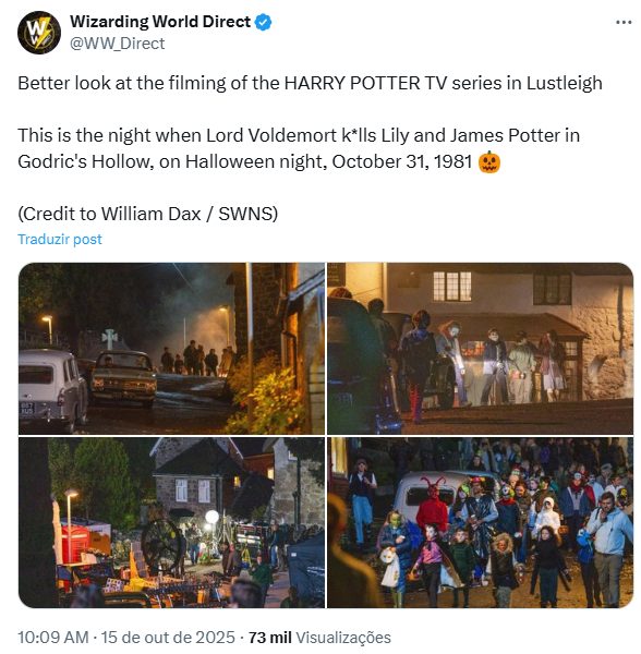 As imagens mais recentes dos bastidores acenderam o alarme no fandom. Elas parecem mostrar a fatídica noite de 31 de outubro de 1981, em Godric’s Hollow, quando Voldemort assassinou Lílian e Tiago Potter. Carros da época, decorações de Halloween e crianças fantasiadas reforçam que a cena deve realmente acontecer.