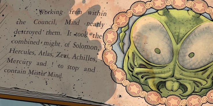 “Foram necessárias as forças combinadas de Salomão, Hércules, Atlas, Zeus, Aquiles, Mercúrio e ! para parar e conter o Senhor Mente”, dizia o livro, como você pode conferir na imagem abaixo (atenção: está em inglês).