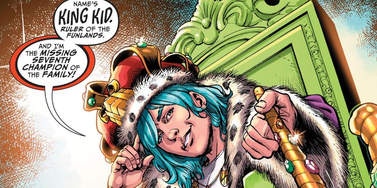 Mas logo foi revelado quem se trata desse sétimo campeão que empresta seus poderes para Billy Batson e é representado pelo ponto de exclamação: uma entidade chamada de King Kid (algo como “Menino Rei”), monarca da chamada Terra da Diversão, um dos seis reinos que são explorados por Billy Batson e sua família nessa história.
