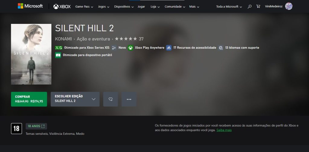 A página oficial do Silent Hill 2 Remake já está ativa na Xbox Store, confirmando sua disponibilidade imediata. A edição padrão é listada por R$ 349,90, mas está sendo vendida por R$ 174,95, valor equivalente à metade do preço cheio. Há também um pacote opcional que combina o remake com Silent Hill f, custando R$ 531,60.