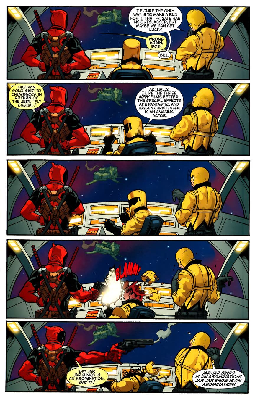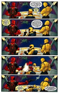 Conforme dito no início do texto, o Deadpool também já revelou ser fã de Star Wars nos quadrinhos. Enquanto fugia da Hydra em uma espaçonave da A.I.M, tocou no assunto, apenas para o homem que estava ao seu lado falar que gosta da trilogia original.