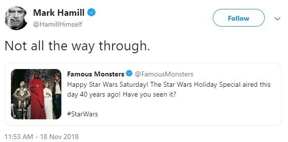 Recentemente, o assunto voltou à tona nas redes sociais. Um usuário do Twitter marcou Mark Hamill em uma publicação que “comemorava” os 40 anos dessa bizarrice audiovisual. A pergunta era simples e direta: será que o intérprete do lendário Luke Skywalker já parou para assistir ao especial em algum momento de sua vida? A resposta do ator foi tão honesta quanto hilária.